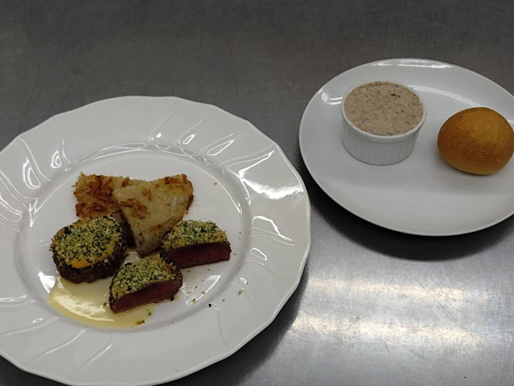 「鹿肉のパン粉焼き」と「猪肉のリエット」を教えて頂きました。